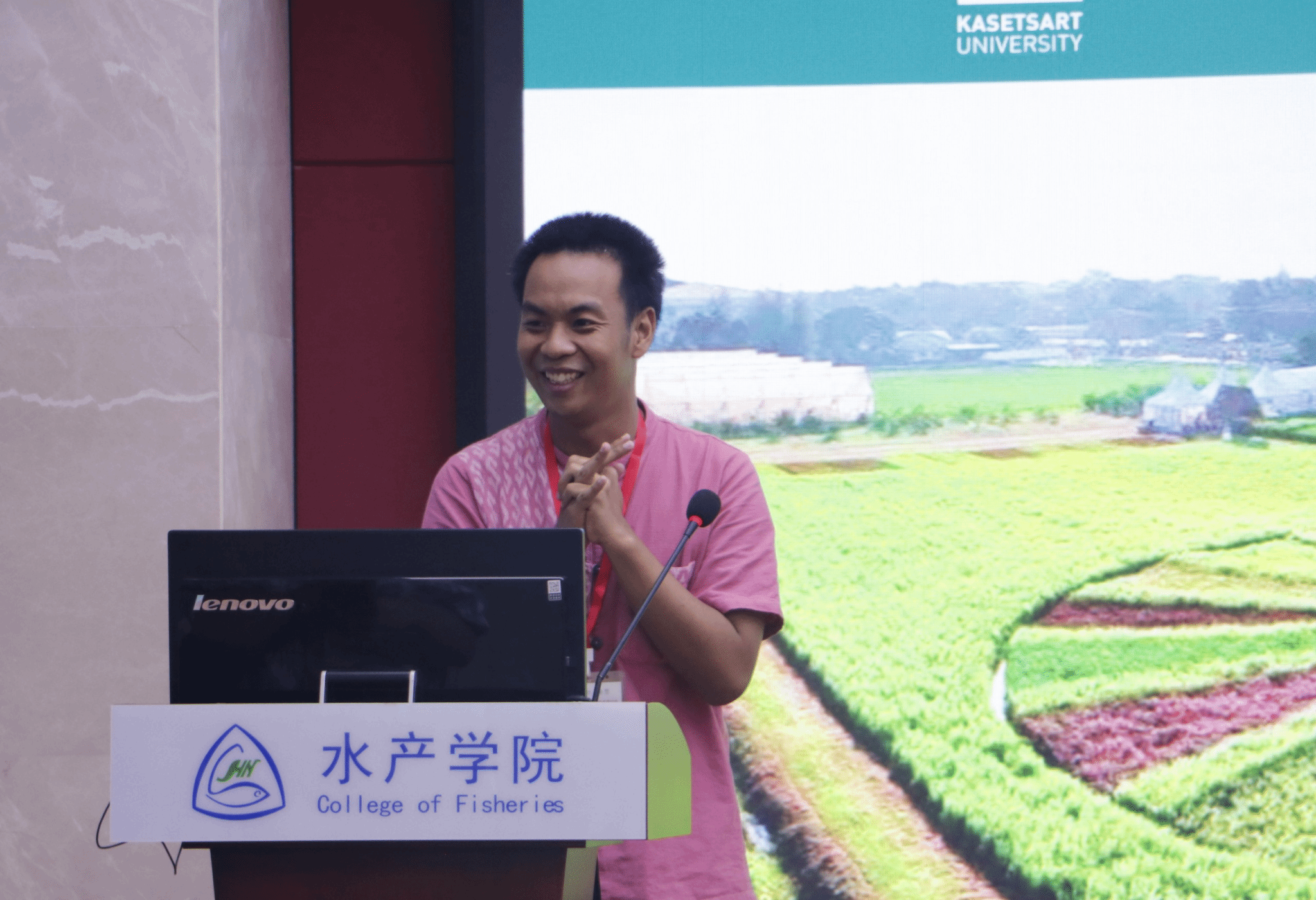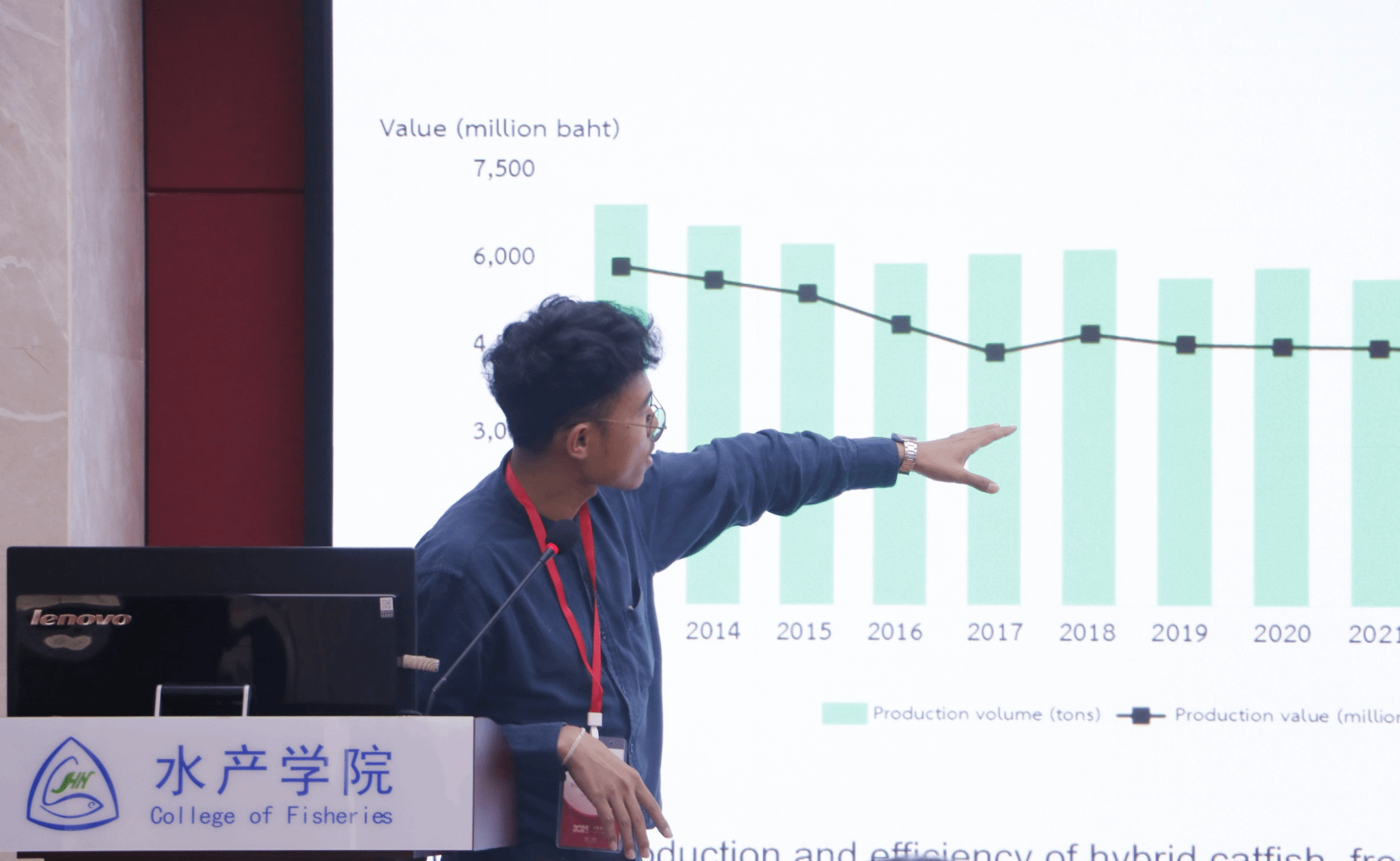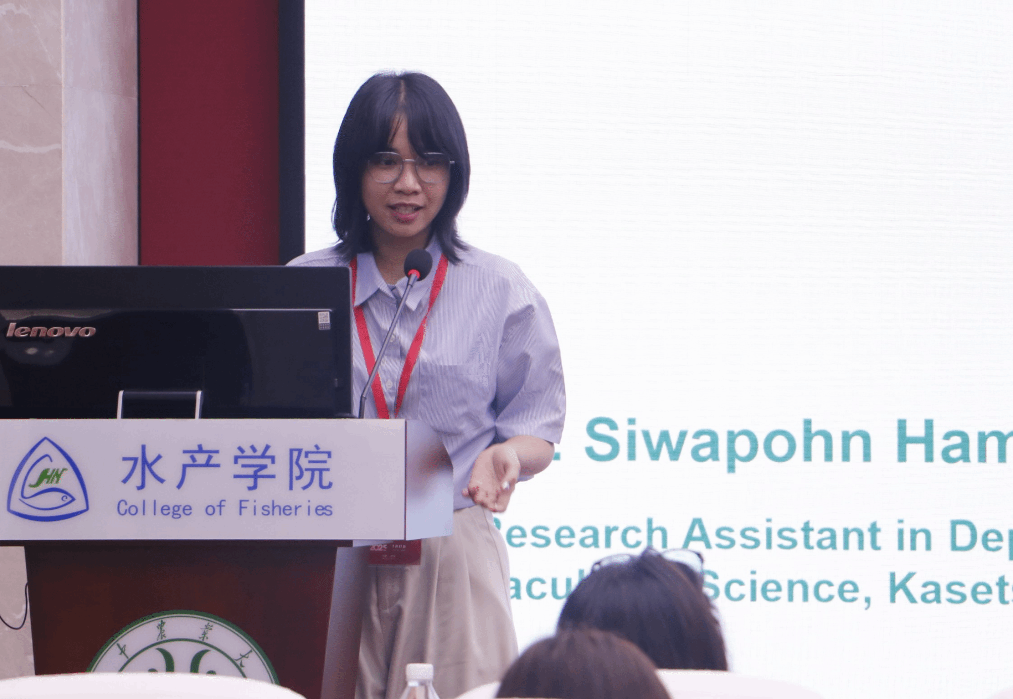 博士后Worapong Singchat作题为“胡子鲶水产养殖:气候变化的影响和对健康的影响”的报告,介绍了温度对杂交鲶鱼卵囊吸收及早期发育的影响机制。报告提及通过多地采样掌握种群动态、借助微量化学分析提升养殖效率与环境适配性,并指出优化幼体养殖池类型、选育优良亲本可提高成活率,可以更好地推动胡子鲇养殖业的发展。