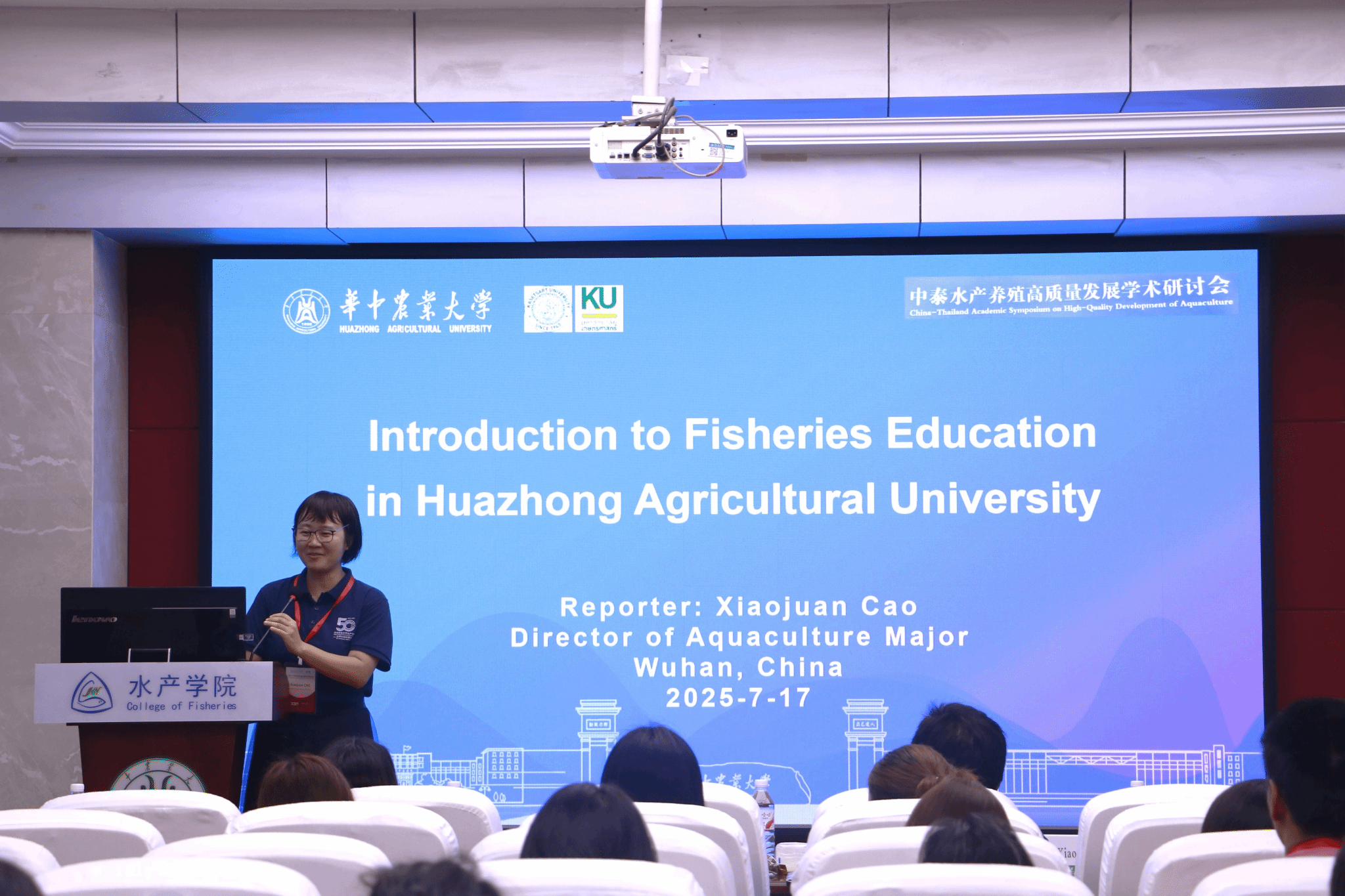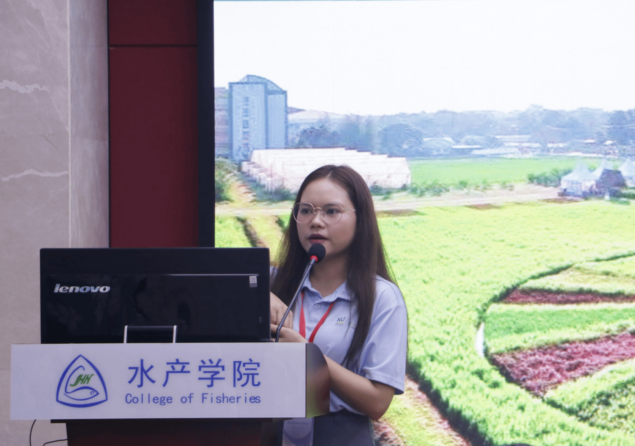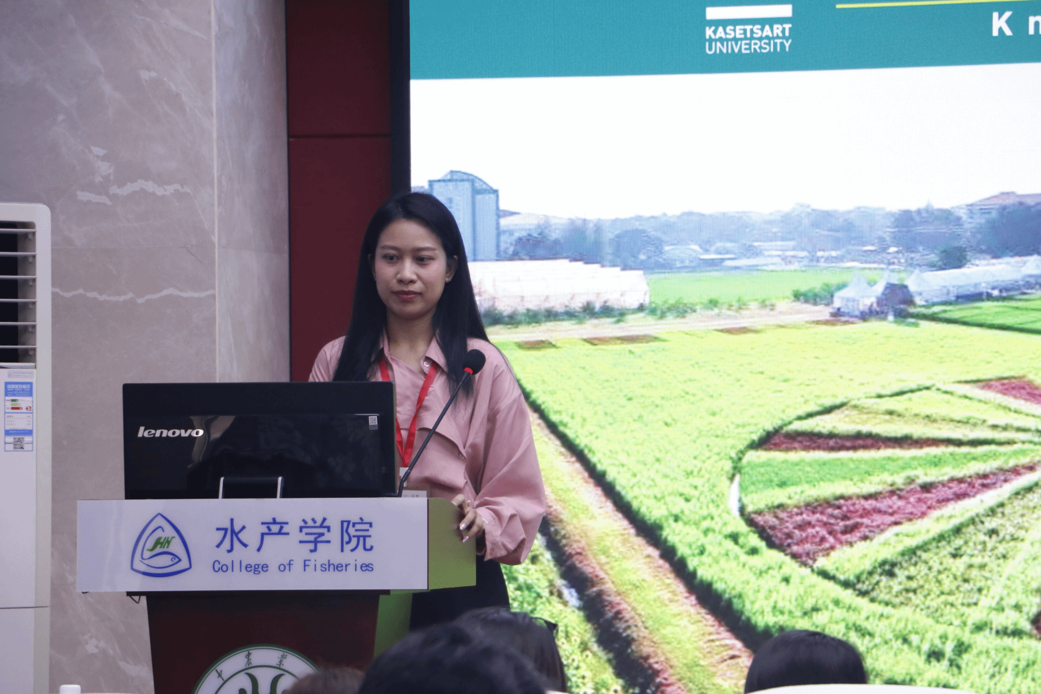 博士后Worapong Singchat作题为“胡子鲶水产养殖:气候变化的影响和对健康的影响”的报告,介绍了温度对杂交鲶鱼卵囊吸收及早期发育的影响机制。报告提及通过多地采样掌握种群动态、借助微量化学分析提升养殖效率与环境适配性,并指出优化幼体养殖池类型、选育优良亲本可提高成活率,可以更好地推动胡子鲇养殖业的发展。