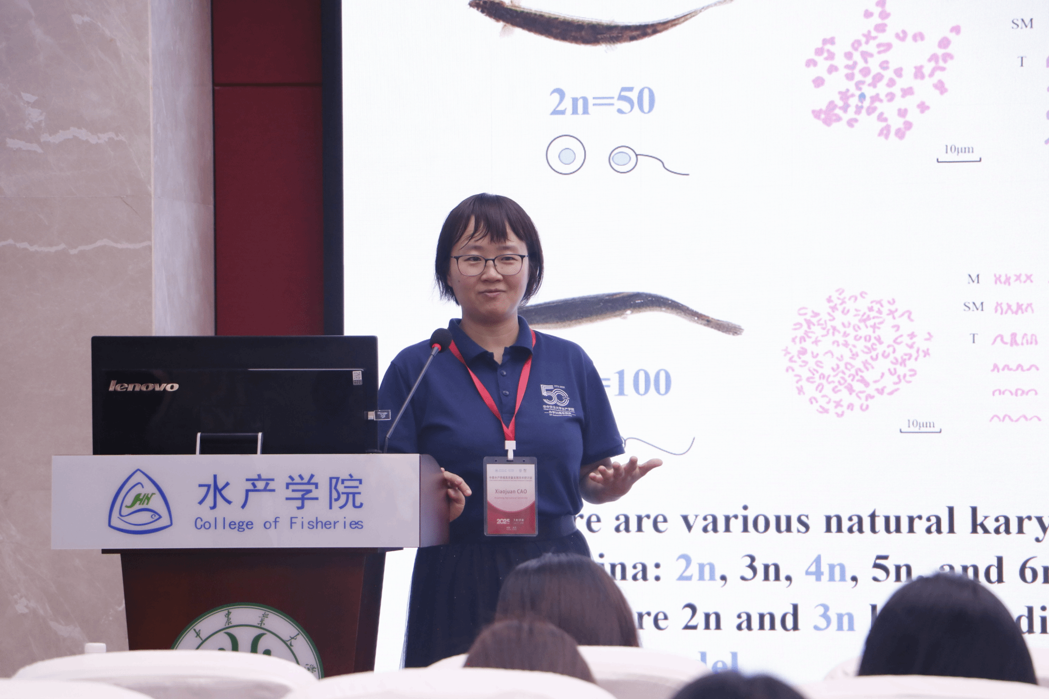 高坚教授和曹小娟教授的学生常雯琦硕士作题为“泥鳅性染色体和性别标记的鉴定”的报告,介绍了全同胞泥鳅混合池WGR鉴定性别的方法。她详细介绍了整个鉴定的操作流程和应用价值,有助于探索性染色体在进化中的机制理解早期形成的原因。