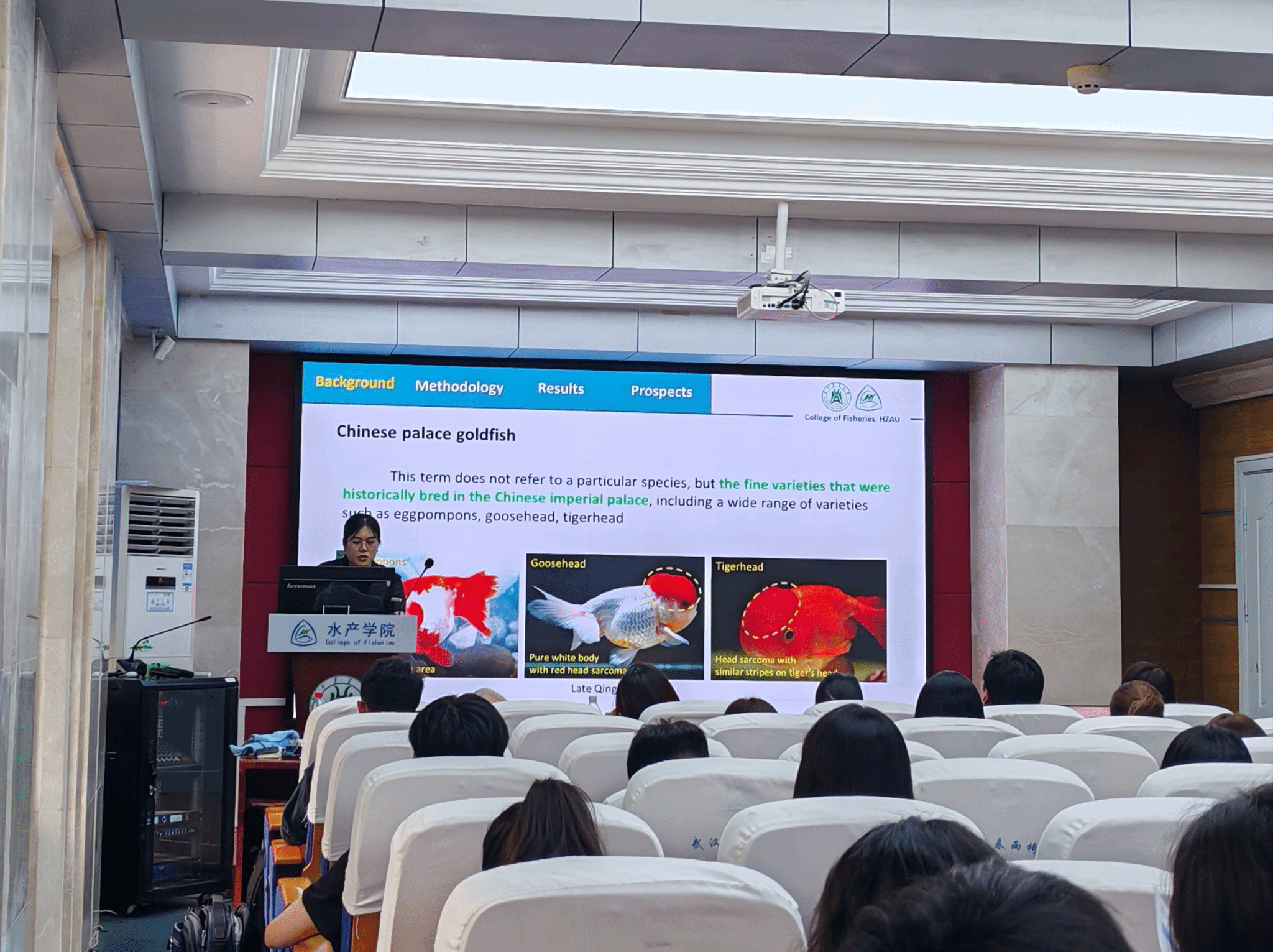 高坚教授和曹小娟教授的学生黄钰微博士作题为“全基因组分析为三种珍贵的中国宫廷金鱼的种质管理和保护提供了见解”的报告,介绍了4个品种特异性SNP用于种质鉴定,15对多态性SSR用于遗传多样性分析。研究显示,所有保护群体均为中度多态;群体遗传学研究发现,头部有肉瘤的鹅头与虎头金鱼亲缘较近,鼻部有瘤的卵瘤金鱼则较远。