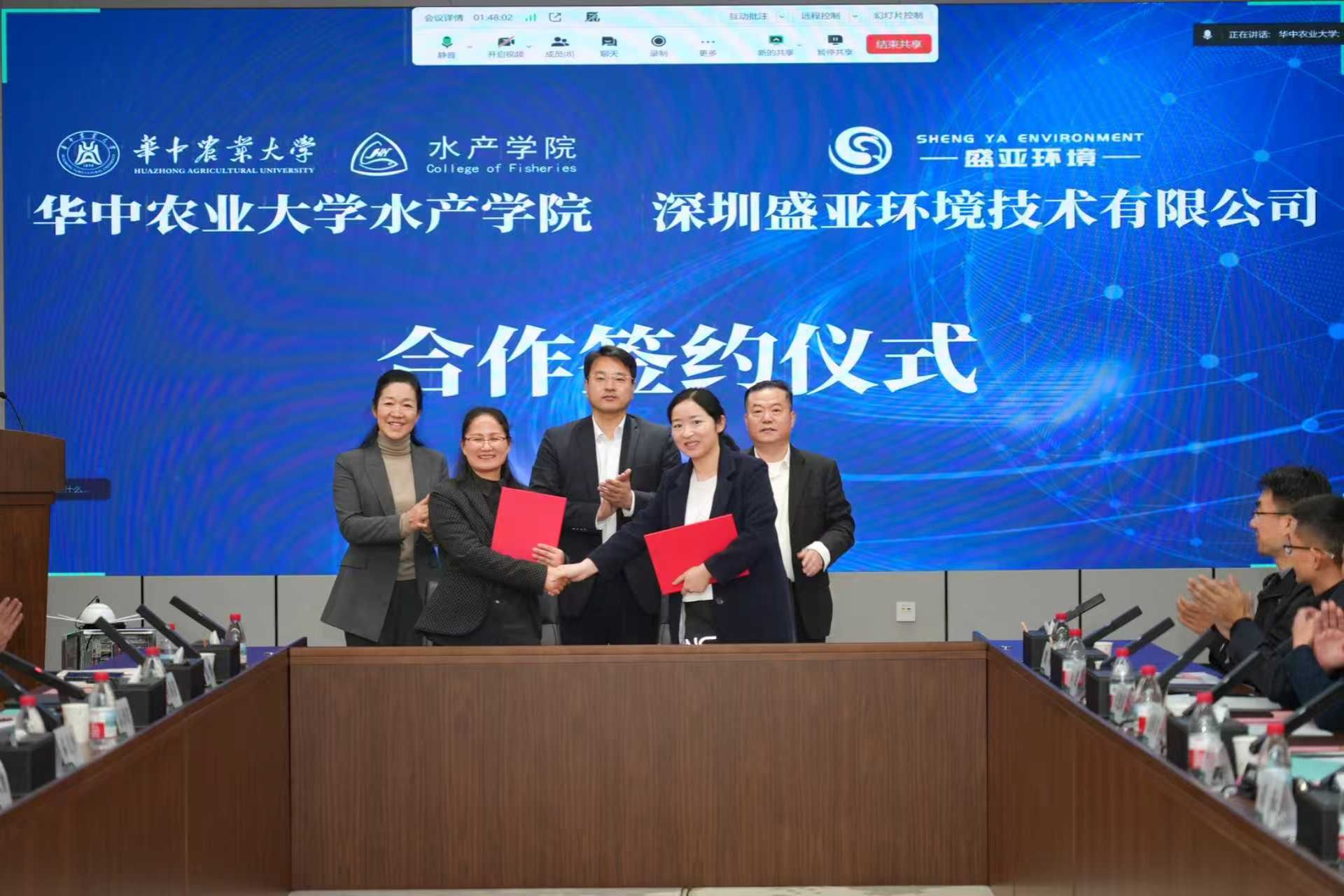 负责人及师生代表,深圳盛亚环境技术有限公司、武汉市五七东方水产养殖有限责任公司等企业代表共同出席签约仪式。四川农业大学冯琳教授、加拿大圭尔夫大学Dominique Bureau教授、新加坡南洋理工大学Loo Say Chye Joachim教授、土耳其阿塔图尔克大学Abdulkadir Bayır教授等国内外专家在线参与并作成果评价。会议由东京热