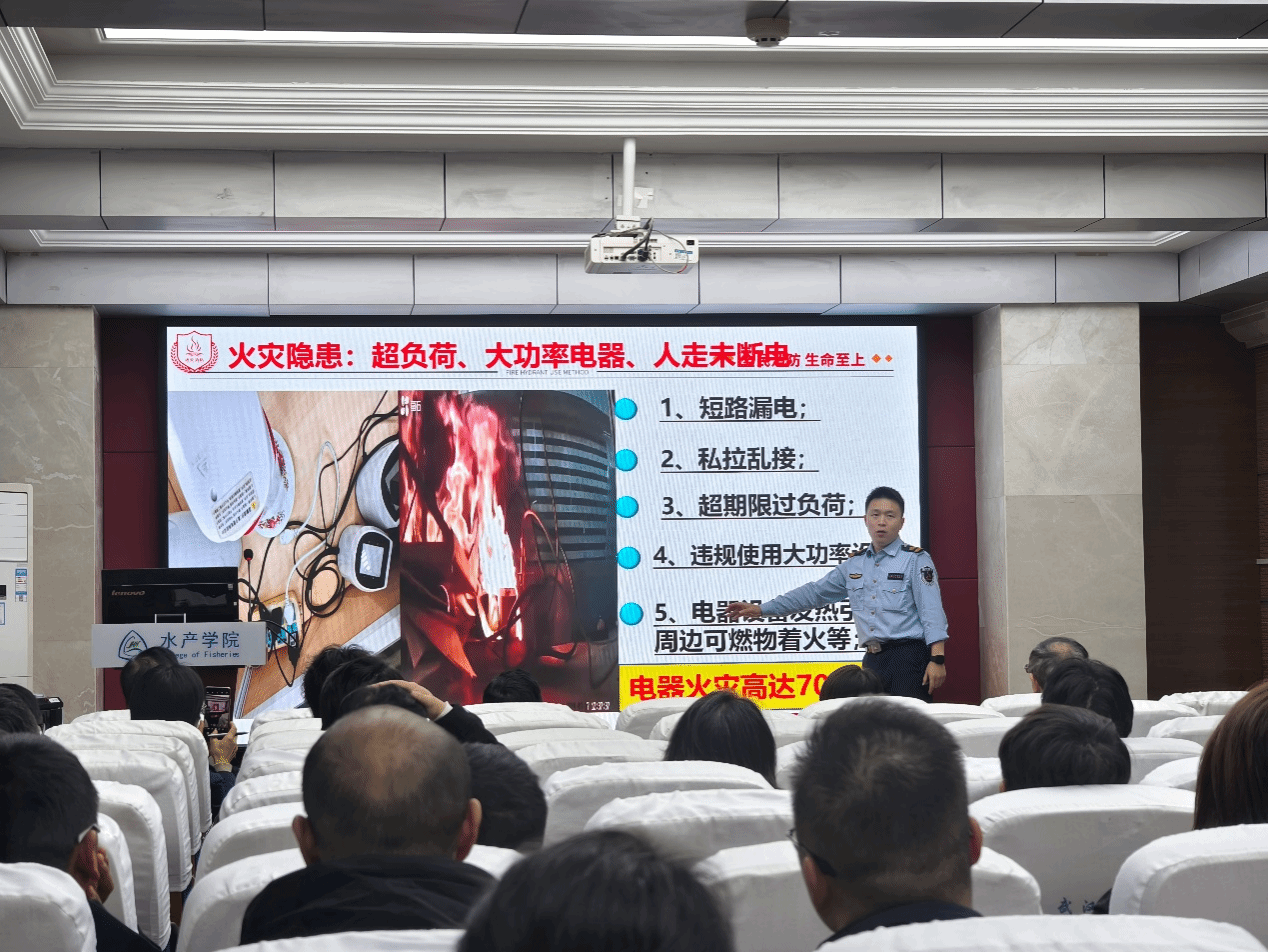在水产楼A105报告厅开展全院教职工消防安全专题教育,邀请武汉市进安消防中心程龙教官进行消防安全培训。会议由学院副院长沈继斌主持。