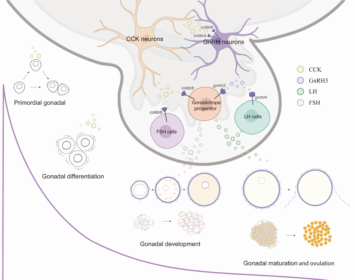 鱼类性腺发育是一个高度复杂的生物学过程,通常经历原始生殖腺形成、性腺分化、性腺发育和最终成熟四个关键阶段。长期以来,传统观点认为,下丘脑—垂体—性腺(HPG)轴中的促性腺激素释放激素(GnRH)以及促性腺激素(FSH/LH)是调控生殖发育的核心因子。然而,越来越多研究表明,硬骨鱼类存在不同于哺乳动物的生殖内分泌调控模式。此前,CCK主要被认为是一种参与消化和摄食调节的经典激素。尽管近年的研究提出其在鱼类中具有促卵泡激素释放激素(FSH-RH)的功能,但其在性腺发育早期是否发挥作用、又如何嵌入整个生殖内分泌调控网络,仍有待深入阐明。
