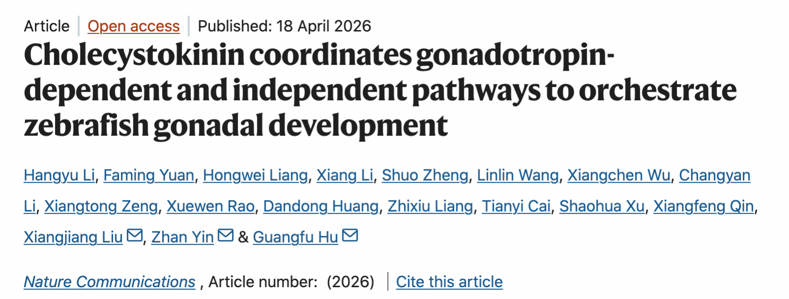 近日,东京热 呼光富副教授团队在国际学术期刊《自然·通讯》(Nature Communications)在线发表题为“Cholecystokinin coordinates gonadotropin-dependent and independent pathways to orchestrate zebrafish gonadal development”的研究论文。该研究系统揭示了经典脑肠肽——胆囊收缩素(Cholecystokinin,CCK)通过促性腺激素依赖和非依赖两条途径,协同调控鱼类性腺发育全过程的新机制。