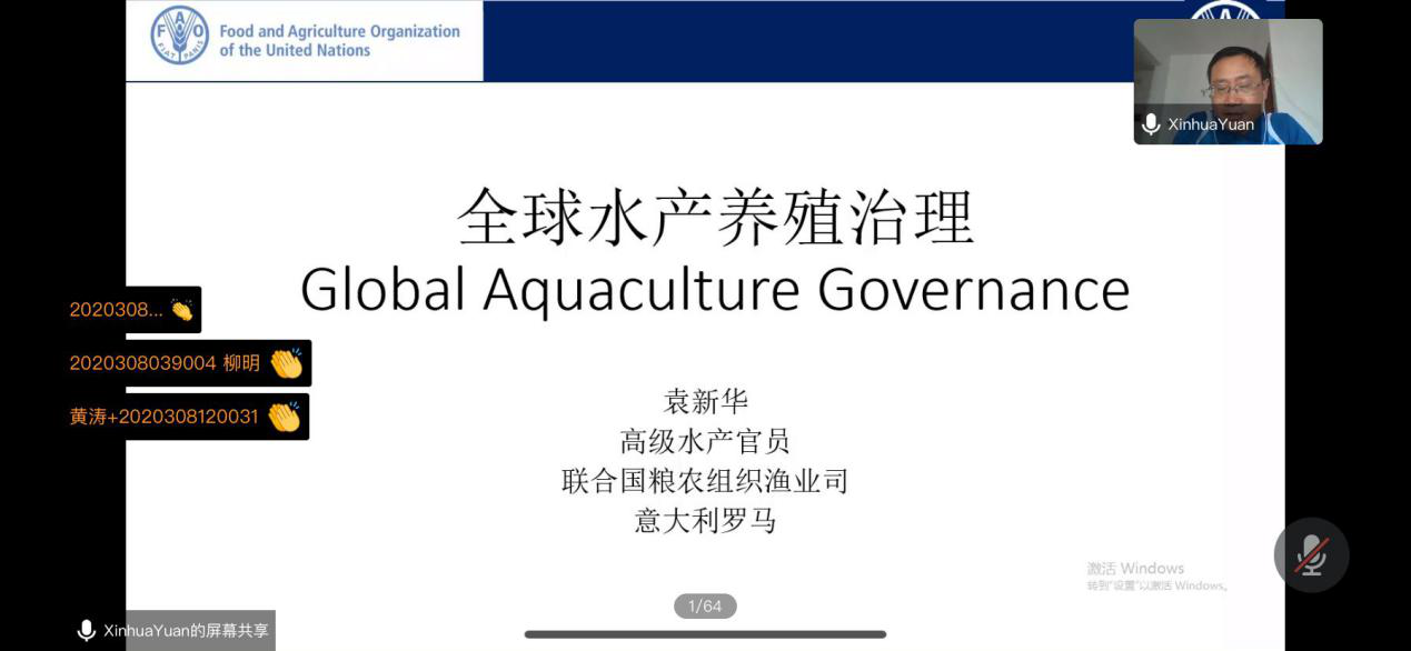 通讯员 缪云亮 供图 缪云亮)9月25日晚上19:00,我校水产讲坛通过腾讯会议在线上举行,联合国粮农组织渔业司高级水产官员袁新华博士应邀作了题为“全球水产养殖治理”的报告,并就在校生申请国际组织实习机会给予指导意见。200余名师生参加了报告会,报告由东京热