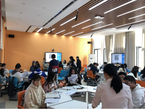 课程开始的前两天,汤蓉老师就通过长江雨课堂给同学们推送预习内容,布置相关思考题,让大家通过课前的预习讨论,小组合作共同完成题目,并以PPT的形式在课堂上进行展示。在上课之前,同学们和参与听课的老师们都早早地来到教室,将小组准备好的讲解内容投放在教室的共享屏幕上,提前预习活页上的学习内容。