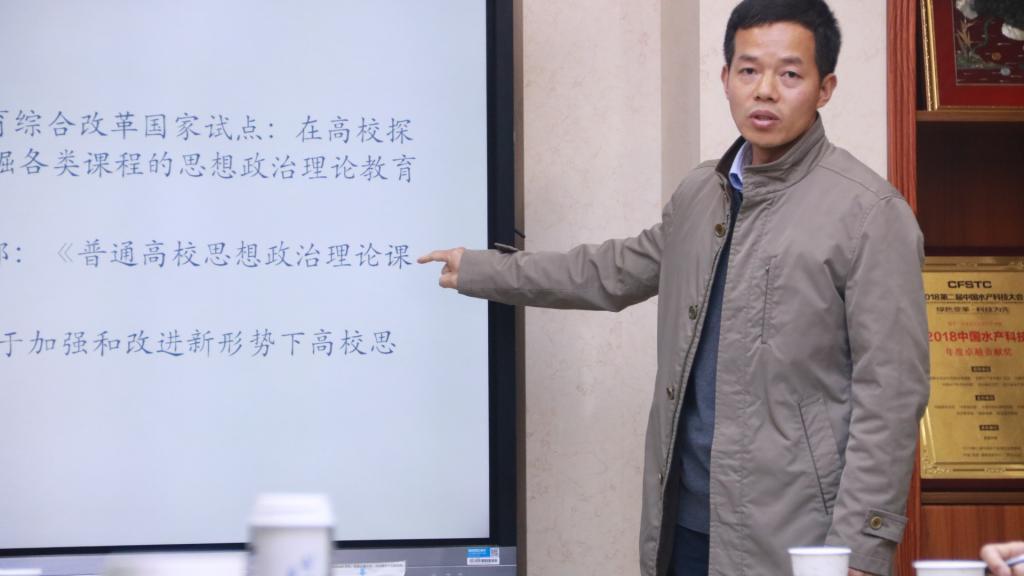会议伊始,《水生生物学》负责人周琼从“广州课程思政会议体会”和“《水生生物学》课程思政的建设两个方面”汇报。周琼就课程思政总体部署、认识误区、建设三忌、建设核心、建设形式、建设要点、功能定义传达广州会议精神。他说:“课程思政建设,要做到传递科学精神,引导学生树立正确的价值观,坚强‘四个自信’。同时也要把握好课堂尺度,既不能缺乏专业性,也不能缺少思政性,要避免道德说教式和生搬硬套式的工作形式,要把课程和思政有机地结合起来。”随后,他就《水生生物学》课程思政的建设目标、建设思路、已开展工作、建设成效四个方面做了分享。