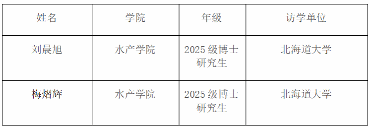根据国家留学基金管理委员会《关于做好2025年创新型人才国际合作培养项目第三批人员申报工作的通知》的有关要求,按照“公平、公正、公开”的原则,经个人申请、学院推荐、学术委员会评审,拟推荐以下学生参加我校“中日现代渔业创新型人才国际合作培养项目”:如对上述情况有异议,请在公示期内,通过来访、来信等方式实名反映问题。