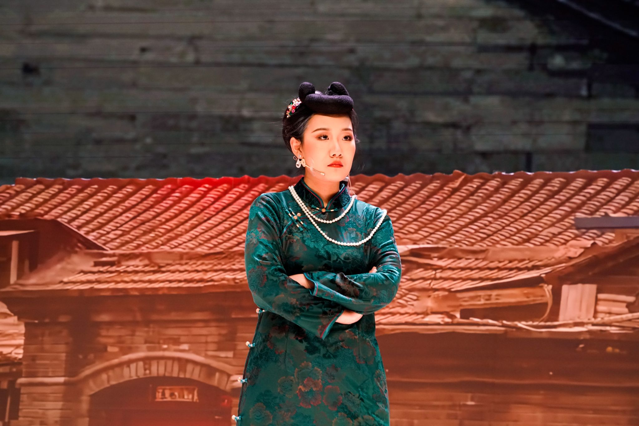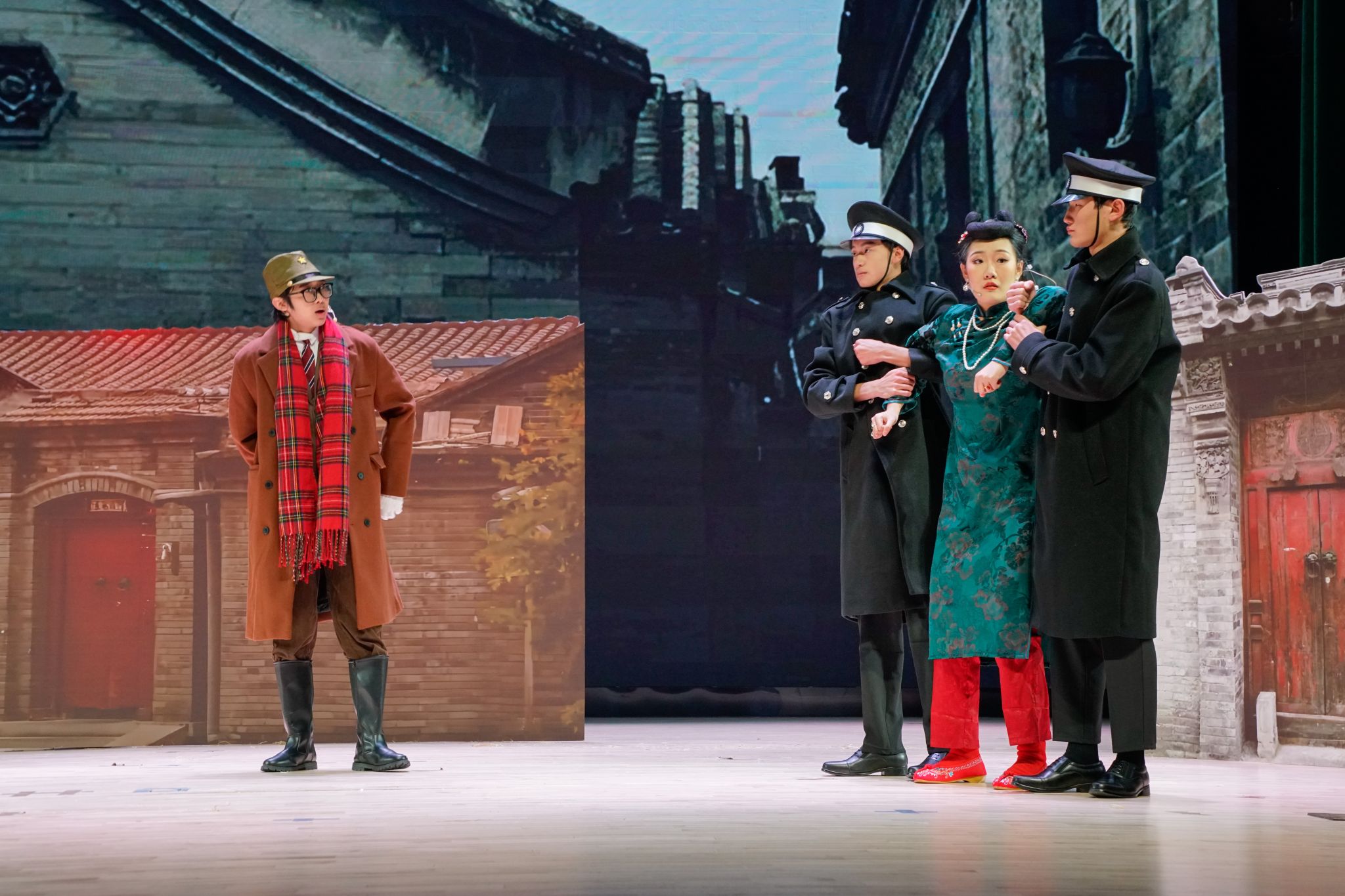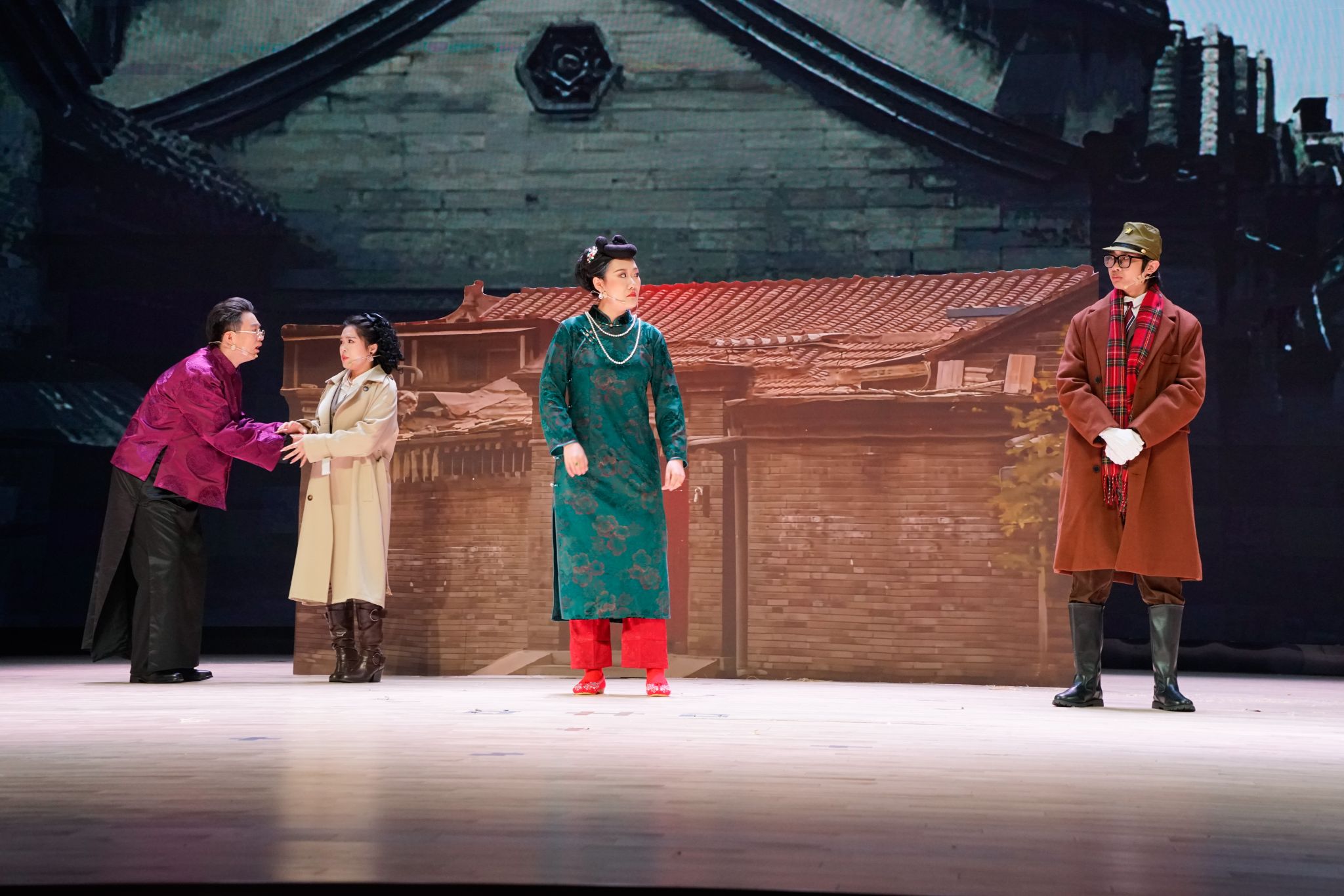 的话剧演员们第8个上台表演。随着灯光的亮起,演员们以真挚饱满的情感开始了深刻动人的演绎。剧中大赤包的饰演者王菁雯以流利的口语和恰到好处的语气将市井小民泼辣的形象演绎的深入人心,该角色虽然做了一些坏事,但始终有自己的坚持和傲气;冠晓荷的饰演者苏畅将冠家落败时对家人的担忧和对未来的迷茫表现得生动形象,一个生活失意的中年人形象跃然台上;郑佳旭则是将被父母宠爱的小女儿的娇俏表现得淋漓尽致,同时也展现出了冠招弟一角想要靠自己兴家立业的傲娇;李空山的饰演者陈冠宇更是将这一角色完美呈现在了观众眼前,无论是走路的神态还是说话的语调,都让人感受到了特务一角的笑面虎特点。生动的表演、考究的服饰,如同历史的长卷,缓缓铺展在观众眼前。