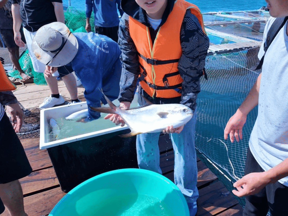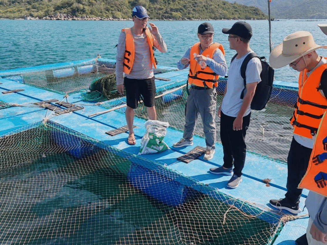 访学团实地考察了芽庄大学海上养殖网箱基地,现场观摩了金鲳的网箱分区管理、饲料精准投喂、催产素注射及母鱼卵质检测等操作流程,并与专家、技术工人进行了现场交流。