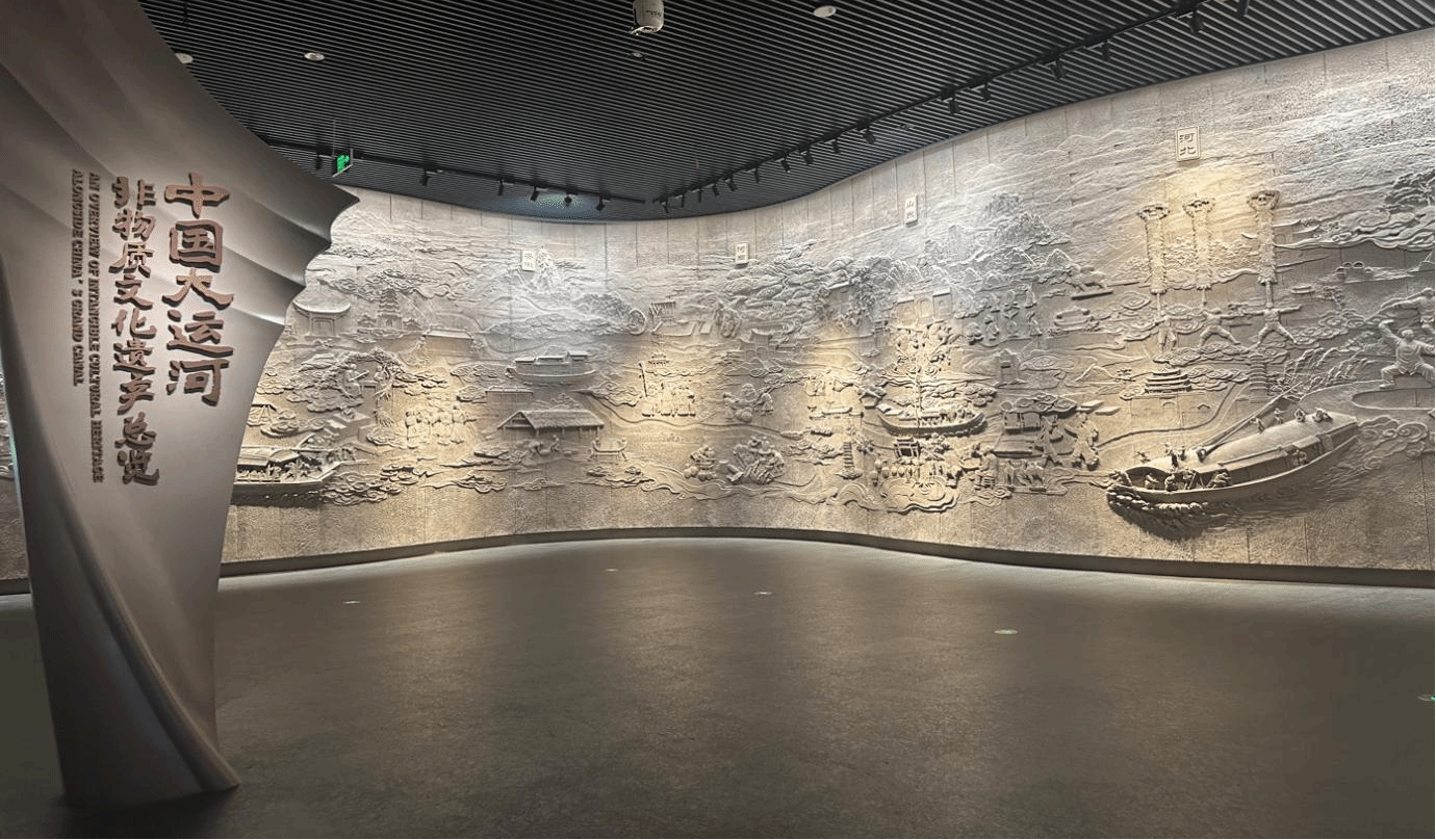 实践小队前往中国大运河非物质文化遗产展示馆。青砖黛瓦的建筑依河而建,漕运沙盘复原明清航运盛况,泛黄的漕运账簿清晰记录南货北运明细。在工坊区,竹篾匠人指尖翻飞编织菱角灯,饮食展区老师傅将豆腐切得细如发丝,苏州评弹艺人的三弦声里满是运河市井故事。午后研讨中,李传贺与罗艺细数剪纸、泥塑、渔具制作等非遗传承故事,认识到运河非遗是“以河为家”的生存哲学载体。