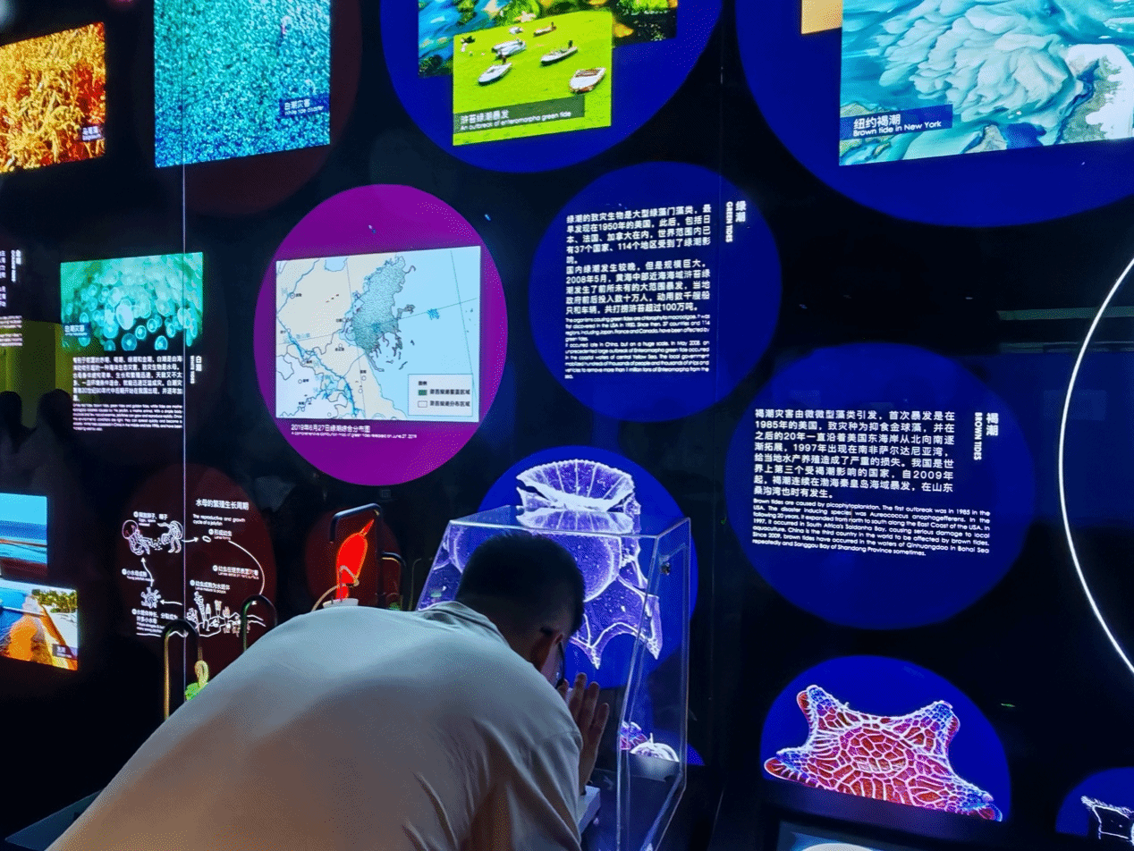 该实践活动包括了天津国家海洋博物馆的参观学习。团队实地学习了海洋知识。参观者最多的还是多媒体互动展区,作为“高科技”展品,自然是受到大家的喜爱与赞美。海洋生物模型周围的屏幕上播放着海洋赤潮、绿潮等现象的相关视频和地图,通过现代科技手段,让参观者了解到海洋生态环境面临的问题,也让大家直观的感受到可持续性发展的重要性。自然淡水里也有赤潮,便衔接补充了我淡水的学习。
