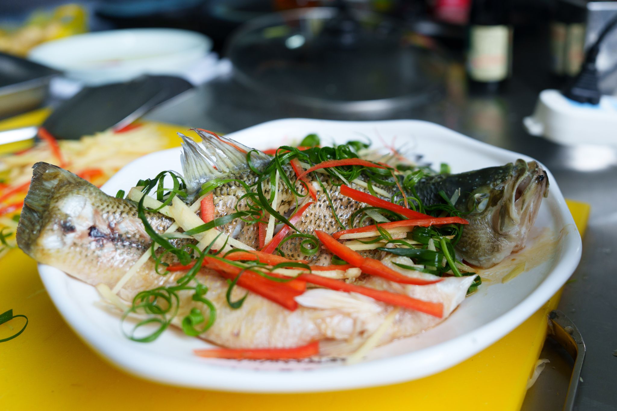 广式清蒸鲈鱼摆盘别致,水产类专业2407班罗琳琅说:“我们处理材料时将鱼骨剁成三段,让鱼肉更加入味。菜品搭配‘三丝’——葱丝、红椒丝、姜丝,因为提前准备的葱个头较小,切起来不便,最后用手撕完成准备,现在想起来还觉得挺有意思的。”