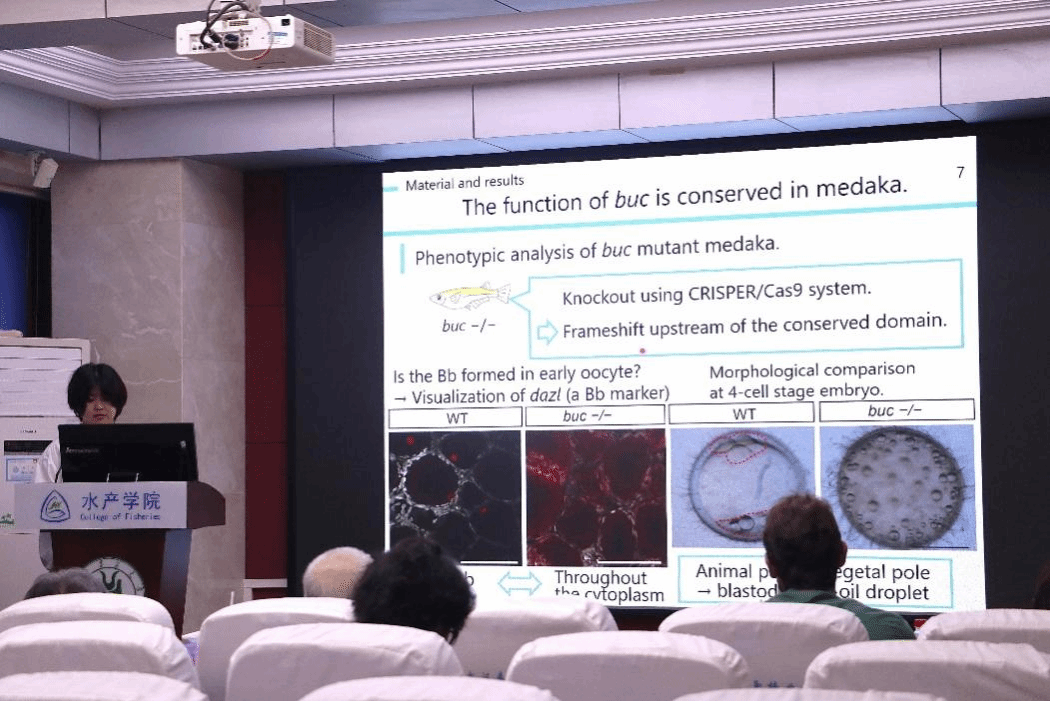 北海道大学Ami AITA博士生作了“青鳉卵子和胚胎发生过程中生殖质因子时空定位”的报告,指出在鱼类中,生殖质对于生殖细胞形成至关重要,继承生殖质的细胞会分化为生殖细胞,且巴尔比尼体(Bb)被认为是生殖质的起源。同时,青鳉中 buc 基因功能大多未知,但过表达 buc 会使生殖细胞数量增加。AITA博士生系统性地概述了青鳉生殖质因子时空定位相关研究,展示了从基因功能研究到蛋白表达定位分析的系统研究思路和方法,为深入探究鱼类生殖发育相关机制提供理论参考。