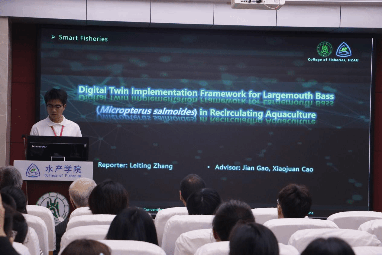 另一位博士生张雷霆作了题为“大口黑鲈循环水养殖系统的数字孪生实施框架”的报告。针对传统水产养殖面临的资源与环境压力,该研究构建了一套六层数字孪生系统:从物理层到决策层,通过水下摄像头、声学传感器等设备实现鱼类摄食行为量化分析,并利用Unity引擎建立三维动态模型。实验显示,该框架能有效整合水温、pH值等环境参数与个体行为数据,显著提升养殖密度与投喂精准度。他强调,数字孪生技术可降低循环水系统30%的运维成本,为智慧渔业发展提供了可复用的技术范式。