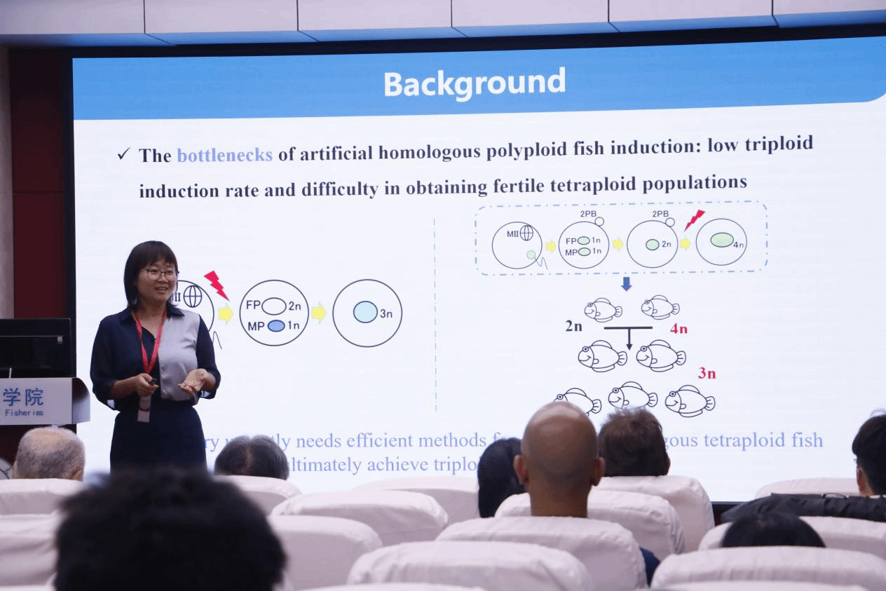 曹小娟教授作了题为“有丝分裂缺陷导致鱼类不减数精子发生”的报告。报告揭示了细胞周期调控关键基因cdk1/2和分离酶基因espl1在鱼类不减数精子发生中的重要作用。通过基因敲除实验,她所带领的团队发现Cdk1和Espl1功能缺陷会导致精母细胞有丝分裂异常,进而产生二倍体不减数精子。这类不减数精子与正常卵子结合后可形成三倍体。通过架设‘三倍体桥’成功获得了人工四倍体。人工四倍体与野生型二倍体交配后,产生了全三倍体群体,孵化率达80%以上。该成果为水产养殖三倍体育种提供了新的技术路径,可解决传统温度休克或静水压诱导法存在的效率低下等问题。