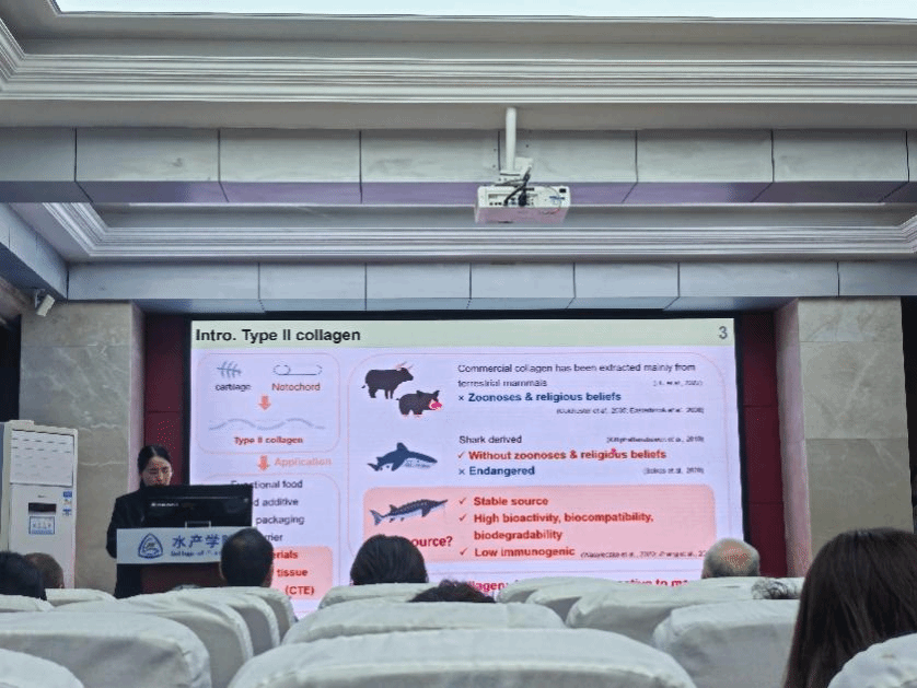 张曦副教授作了“鱼类Ⅱ型胶原蛋白在ATDC5细胞和人类干细胞培养中展示出软骨形成潜能”的报告。张曦博士运用 “翻转接触法” 成功使鱼源 Ⅱ 型胶原在体外自组装成纤维层,实现可重复的纤维表面构建,纤维平均直径与天然相近。通过定量逆转录聚合酶链反应检测发现,鲟鱼 Ⅱ 型胶原纤维促使 ATDC5 细胞中早期、中期软骨标记基因以及肥大软骨细胞相关基因表达上调,表明细胞积极向软骨诱导方向发展。为生物材料在水产及医学相关领域的应用研究提供了新视角和理论基础。
