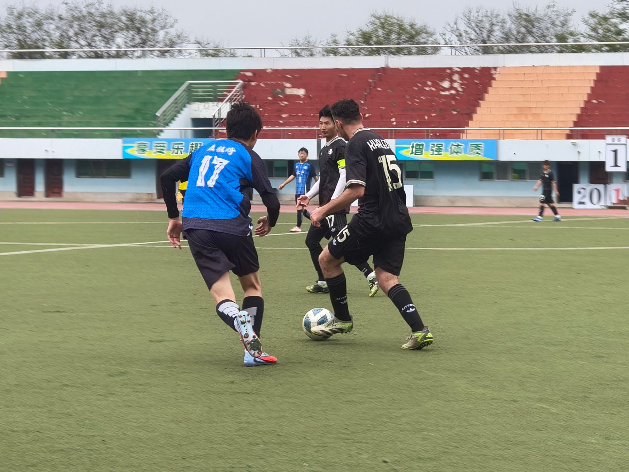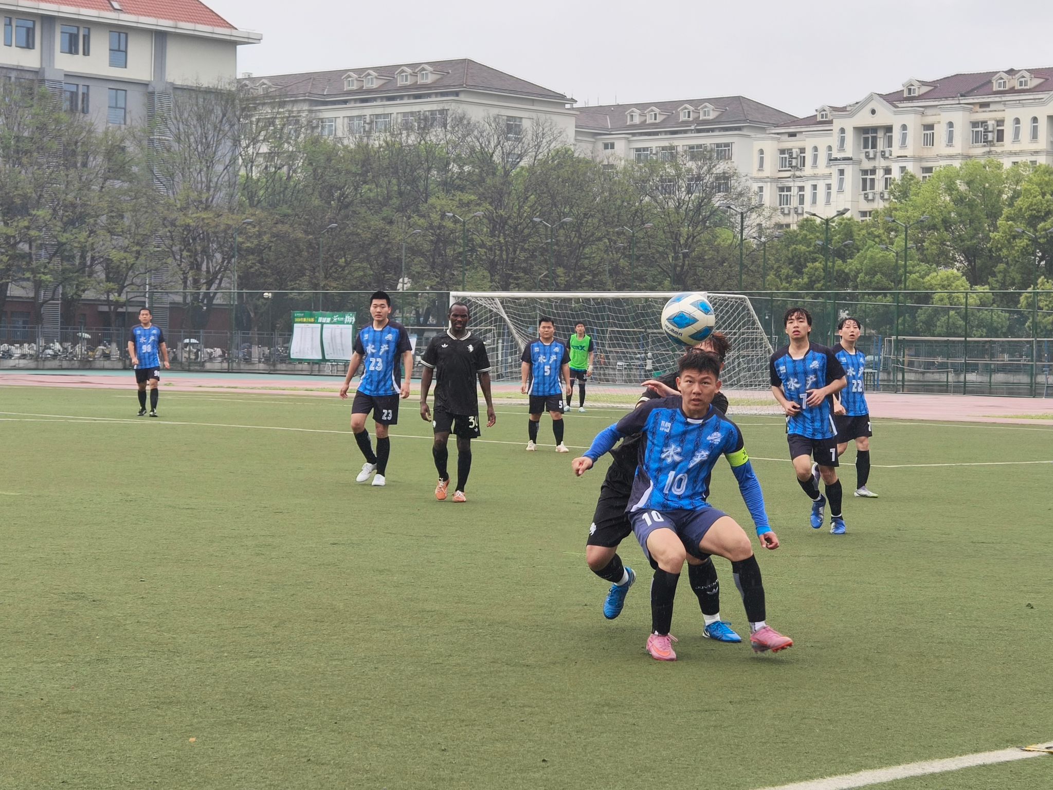 半决赛迎战强敌资源与环境学院代表队。比赛在雨中拉开帷幕,湿滑的场地、积水的草皮,加上风和雨的阻碍,让每一次奔跑和传球都变得格外艰难。开局阶段便陷入被动,比分处于落后。即便后续全队奋力反扑,可对方全线退守严防死守,再加上场地积水严重影响发挥,最终依旧没能改写战局,遗憾失利,无缘决赛。