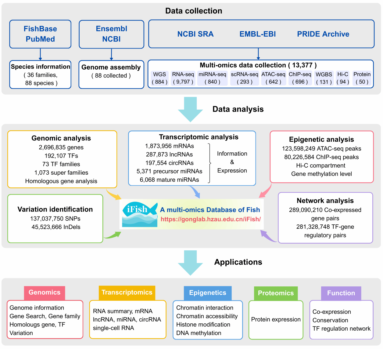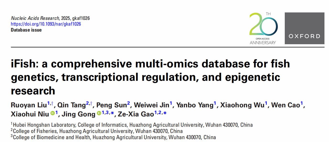 高泽霞教授团队联合信息学院龚静教授团队在Nucleic Acids Research期刊上发表题为“iFish: a comprehensive multi-omics database for fish genetics, transcriptional regulation, and epigenetic research”的研究论文。该团队开发的“iFish”综合性鱼类多组学数据库(//gonglab.djre.net/iFish/),不仅整合了基因组图谱、基因表达谱、表观遗传修饰及蛋白质组数据,还实现了遗传变异、转录因子(TFs)及非编码RNA(ncRNAs)的系统鉴定。它是迄今为止系统整合、分析和存储鱼类多组学数据的最全面平台,将成为鱼类遗传学、转录调控和表观遗传学研究的重要资源。